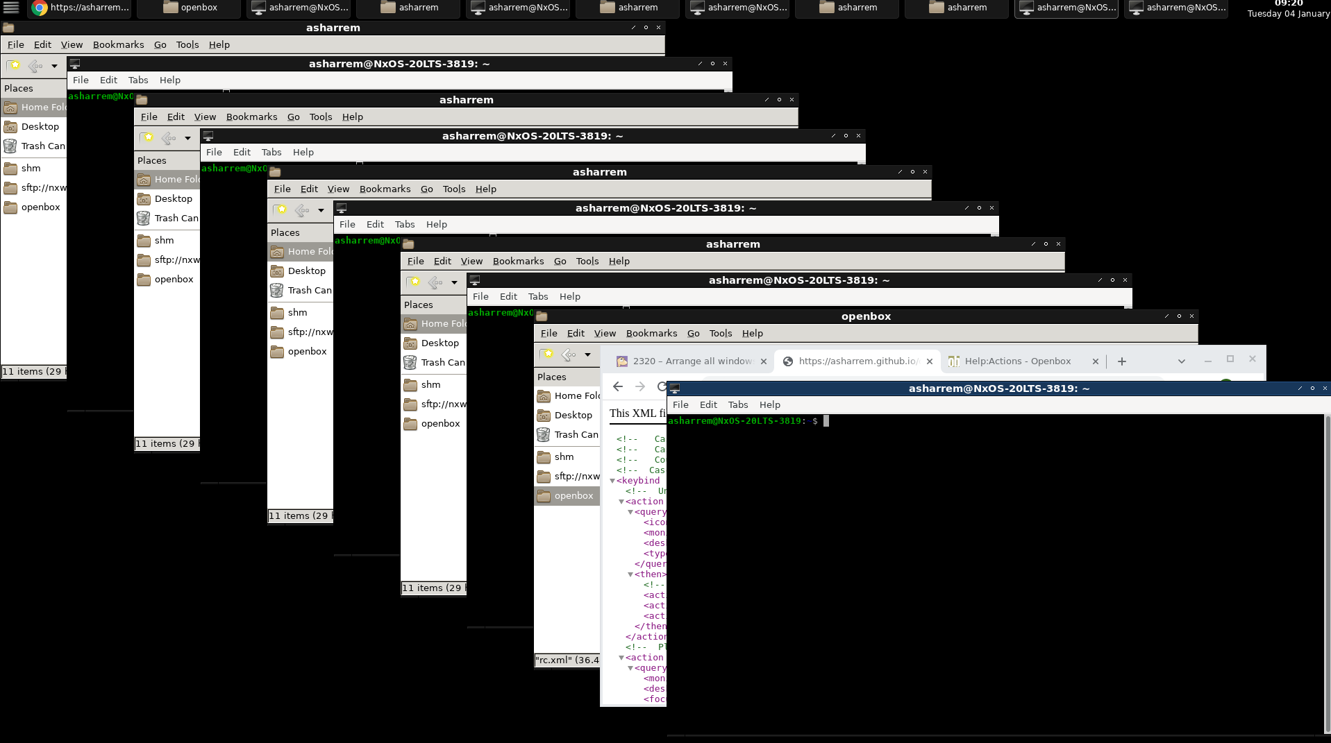 Created attachment 3633 [details] Cascading Openbox Client WindowsCreated attachment 3634 [details] Cascading Open Client WindowsIt is now possible to do an action on all (or a subset of) windows - sequentially - using the "ForEach" action. For a number of years I've been searching how I might "Cascade" windows, with most every reference saying it can't be done with openbox alone, and to use a "Tiling" application. Well...using a looping action/condition we can achieve a "cascade per monitor" keybind. The nested loop structure is; ForEach Move each Window to Top Left Lower ForEach Nudge All Windows The result is a bit like the first action of a "Card Shuffle", and the nested loops will "Cascade" client windows. With a few other "actions" we are able to maintain "Focus" or include "minimized/iconified" client windows. Un-iconifying or maximizing minimized windows requires the iconified window gets "Focus", so I am unable to maintain focus of the original window in this instance. refer: https://asharrem.github.io/cascade_rc.xml Note - Feature Request: <monitor> tag to support special values "current" or "other" - as it does with the <desktop> tag. This would negate the requirement to have a keybind per monitor.