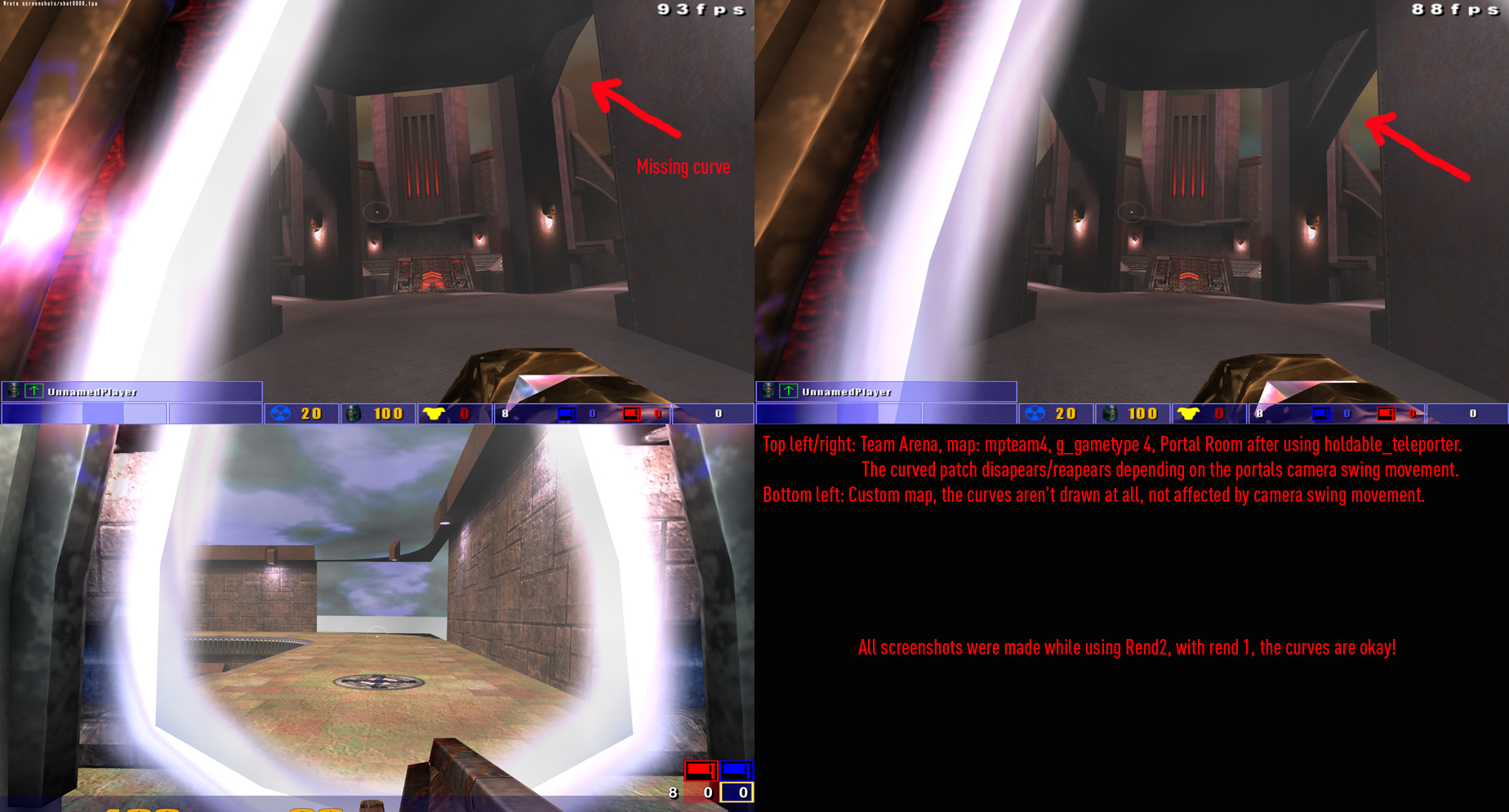 Created attachment 3325 [details] missing_curves_through_portals Curves, seen through portals, are sometimes not drawn. See attached screenshot for more details! Sorting issue? This bug only occurs with Rend2, not with the default renderer. -------------------------------------------------------------- Testing System/OS: Win7 64-bit/Nvidia GT 555M Compiled with MinGW and also with MSCV 2008 on Win7 64-bit. -------------------------------------------------------------
